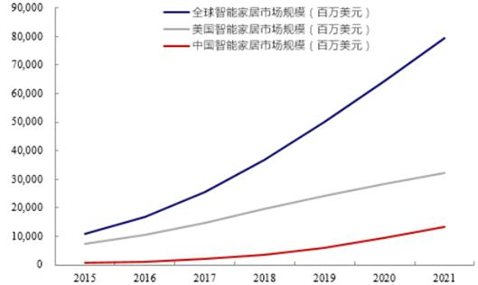 近年來智能家居市場進(jìn)入快速拓展期,用戶滲透率快速增長。根據(jù)調(diào)查數(shù)據(jù)顯示,2017 年美國智能家居市場規(guī)模將達(dá) 146 億美元,滲透率提升至 32.5%,預(yù)計 2021 年將達(dá)到 60.7%。而中國智能家居市場規(guī)模也超過 20 億美元, 滲透率為 2.6%,與美國相比差距較大,未來發(fā)展空間廣闊。隨著語音識別技術(shù)不 斷成熟,智能音箱作為語音交互載體,在控制智能家居的便捷度和體驗上都將逐 步優(yōu)于智能手機(jī)。未來智能音箱有望成為智能家居的控制中樞,成為一個開放性的平臺,可以讓客廳的智能電視、電燈、空調(diào)等鏈接起來,通過語音交互來實現(xiàn)對于其他智能家居產(chǎn)品的控制,掌握了智能音箱便掌握了智能家居的入口。