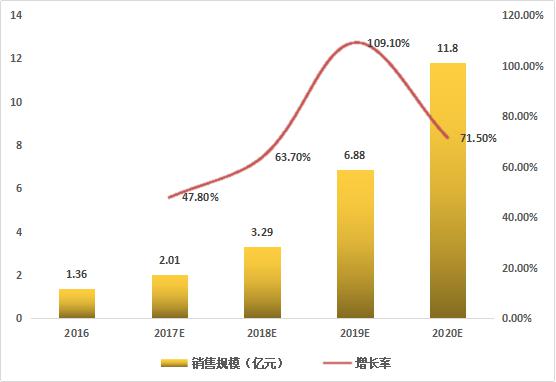 根據(jù)艾媒咨詢數(shù)據(jù)顯示,2016年中國智能音箱銷售規(guī)模為1.36億元,預(yù)計2017年將突破兩億,達(dá)到2.01億,增長率為47.8%;預(yù)計到2020年,智能音箱銷售規(guī)模將超過10億元。目前雖眾多廠商已推出智能音箱產(chǎn)品,但市場總體銷售規(guī)模仍處于較低水平,隨著產(chǎn)品進(jìn)一步優(yōu)化升級及智能家居的推廣,中國智能音箱消費市場潛力將得到釋放,行業(yè)有望迎來爆發(fā)式增長。
