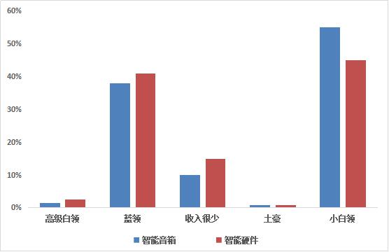 從上述圖表中可以看出,智能音箱用戶以小白領(lǐng)、藍(lán)領(lǐng)等一定消費能力的人群為主,智能音箱小白領(lǐng)用戶占比更高。