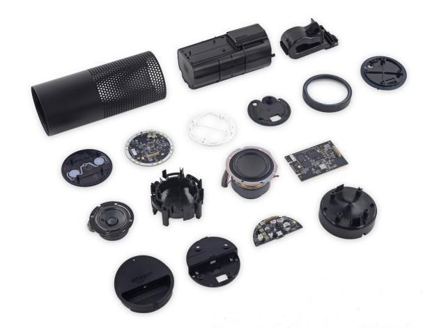下圖展示了 Echo 拆解后的部件??梢钥吹?,智能音箱的硬件并不算復(fù)雜(相對于無人駕駛等“重型”AI 產(chǎn)品)。