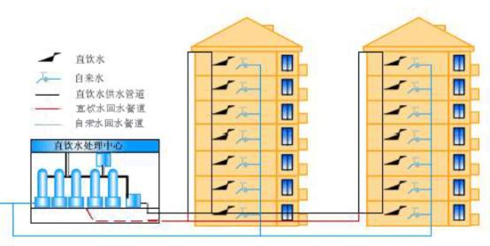 管道直飲水也稱分質(zhì)供水,興建于20世紀(jì)90年代中期,主要分布在人口較為集中的學(xué)校、醫(yī)院、商務(wù)樓宇、較高檔的小區(qū)。分質(zhì)供水是以自來水為原水,把自來水中生活用水和直接飲水區(qū)分開,另設(shè)管道直通住戶,實現(xiàn)飲用水和生活用水分質(zhì)、分流,達(dá)到直飲的目的。管道直飲水通過中央凈水設(shè)備在自來水提供的原水基礎(chǔ)上經(jīng)過再凈化過程提供給人們飲用,通過一些物理過濾、消毒殺菌等深度處理技術(shù)對自來水進(jìn)行進(jìn)一步處理,去除水中的有機(jī)物、重金屬、細(xì)菌、病毒等有害物質(zhì),滿足優(yōu)質(zhì)優(yōu)用、低質(zhì)低用的要求。
