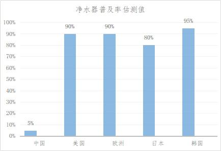 中國市場凈水器普及率相比歐美發(fā)達(dá)國家較低,凈水器普及率僅約占5%,同時市場總規(guī)模也較其他廚衛(wèi)電器較小。