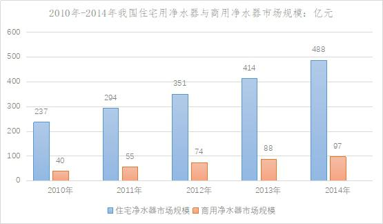 中國凈水器應(yīng)用市場主要是居民及商業(yè)凈水器市場。2014年國內(nèi)商用凈水器市場達(dá)到97億元,居民住宅凈水器市場規(guī)模達(dá)到488億元,同時住宅凈水器市場占比明顯大于商用凈水器市場。