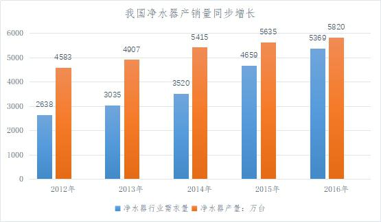 2012 年以來,我國凈水器的產(chǎn)銷量逐年增長,市場需求不斷擴(kuò)大。2016 年,凈水器產(chǎn)量達(dá)到 1,347.8 萬臺,銷量為 1,353.4 萬臺。從 2014 年開始,凈水器產(chǎn)銷量增速雙雙放緩,市場進(jìn)入調(diào)整期。相對于整個家電行業(yè)而言,凈水器市場仍然維持著較高增速,市場潛力較大,競爭激烈。