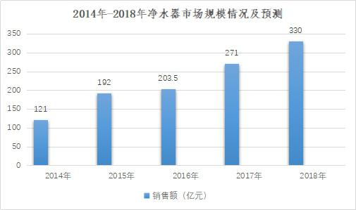 我國凈水器市場尚未完全開發(fā),目前我國凈水器市場覆蓋率僅5%,而韓國的市場覆蓋率高達(dá)95%。這其中,蘊含著巨大的商機(jī),未來凈水器市場可以發(fā)展成上千億乃至更多的產(chǎn)業(yè)。根據(jù)中商產(chǎn)業(yè)研究院發(fā)布的《2018-2023年中國凈水器市場前景及投資機(jī)會研究報告》數(shù)據(jù)顯示,2016年中國凈水器銷售規(guī)模為203.5億元,同比增長40.6%;2017年中國凈水器市場規(guī)模達(dá)271億元,同比增長33.2%,其中線上可達(dá)213億元,線下可達(dá)58億元。同時,在2018年中國凈水器銷售規(guī)?;?qū)⑼黄?30億元。