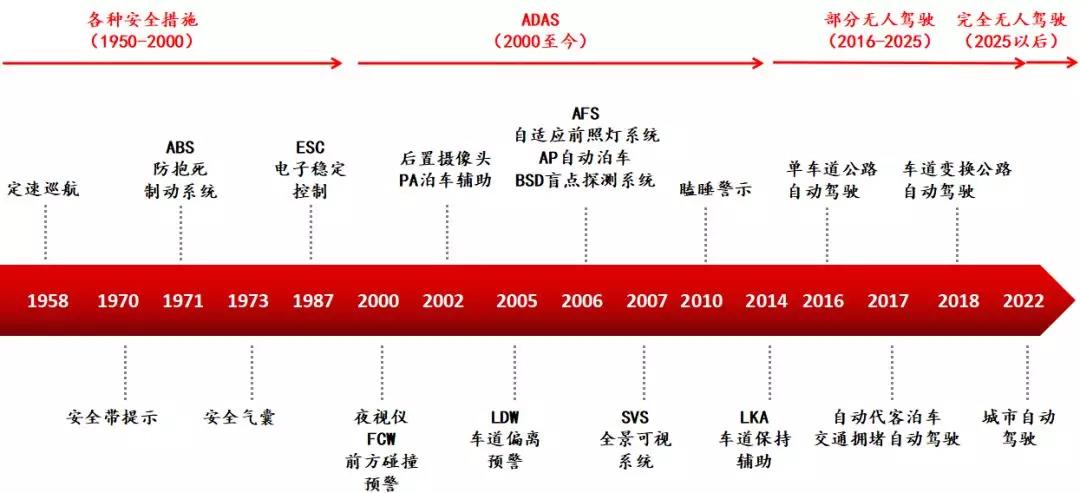 無人駕駛技術(shù)最初的發(fā)展從減少、防止機(jī)動車事故開始。從1950年至2000年,OEM車廠和Tier 1的零部件制造商對車輛發(fā)明、生產(chǎn)了許多結(jié)構(gòu)性的改進(jìn)。最核心的就是四大安全系統(tǒng):安全帶,防抱死制動系統(tǒng)(ABS),安全氣囊和電子穩(wěn)定控制(ESC)。