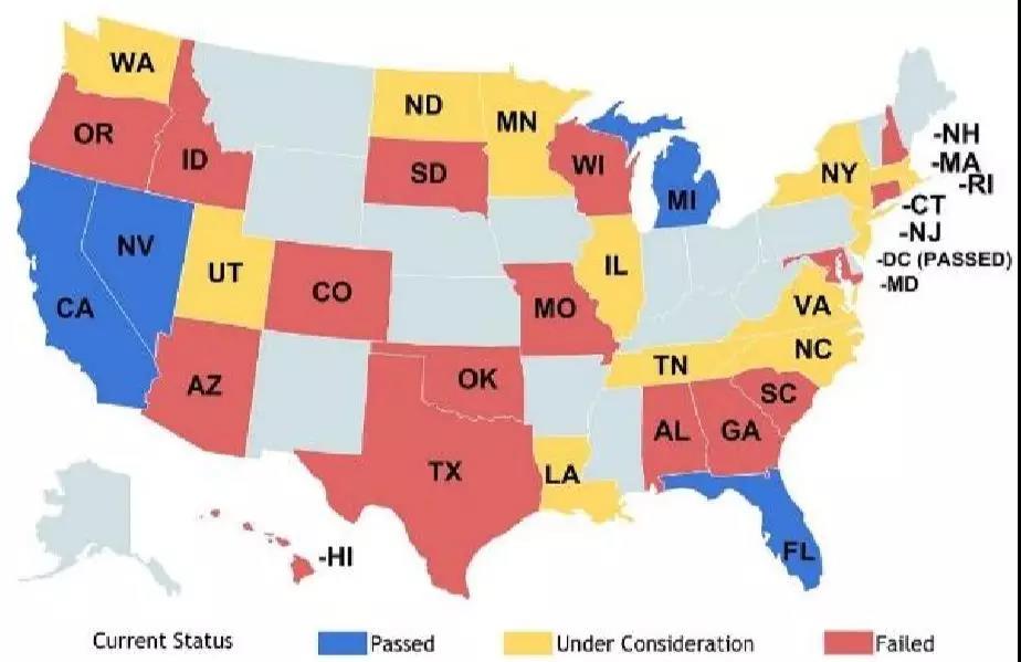 隨著無人駕駛技術(shù)的不斷發(fā)展演進(jìn),對無人駕駛的立法變得十分重要。截至2015年,美國已經(jīng)有16個(gè)州啟動無人駕駛立法;截至2014 年是12個(gè)州,截至2013年是9個(gè)州,截至2012年是6個(gè)州。Nevada 在2011年授權(quán)無人駕駛車的運(yùn)營,是全美第一個(gè)授權(quán)無人駕駛的州。之后,California,F(xiàn)lorida,Michigan,North Dakota,Tennessee和 Washington D.C 針對無人駕駛通過了相關(guān)的法案。Arizona州長簽署了無人駕駛的行政命令。
