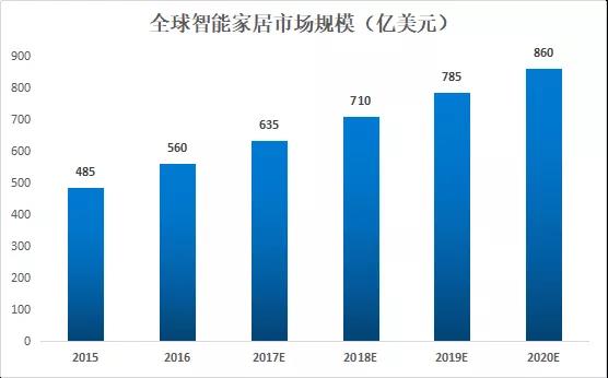 根據(jù)GFK統(tǒng)計(jì),全球智能家居市場(chǎng)規(guī)模在2015年達(dá)485億美元,隨后增速逐漸趨緩,預(yù)計(jì)仍然維持每年約80億美元的增速。預(yù)計(jì)2018年市場(chǎng)規(guī)模將達(dá)到710億美元。