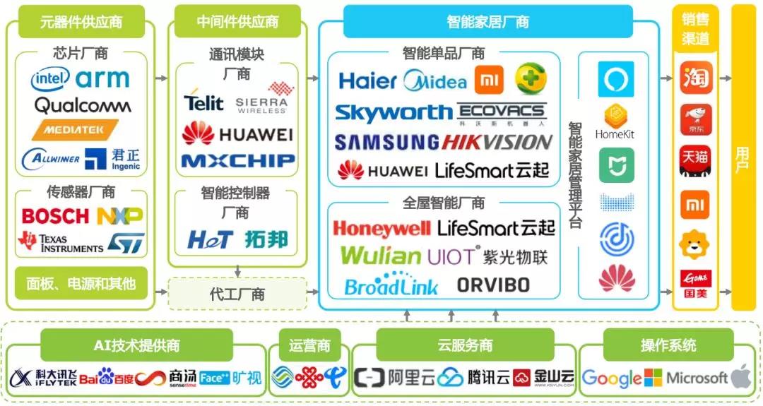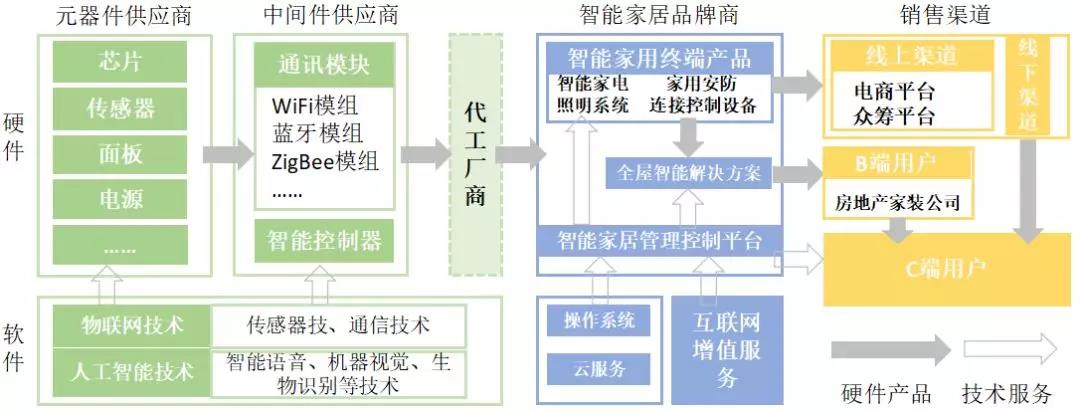通常所指的智能家居企業(yè)為智能家居品牌商,涵蓋向最終用戶(hù)提供終端產(chǎn)品、解決方案和設(shè)備管理控制平臺(tái)的企業(yè),底層除物聯(lián)網(wǎng)操作系統(tǒng)、云服務(wù)作為管理控制平臺(tái)的支撐外,還包括內(nèi)容服務(wù)、生活服務(wù)等互聯(lián)網(wǎng)增值服務(wù)。智能家居產(chǎn)業(yè)鏈上游主要是芯片、傳感器等元器件供應(yīng),以及通訊模塊和智能控制器等中間件供應(yīng)商。品牌商可以通過(guò)線(xiàn)上、線(xiàn)下零售渠道直接向C端用戶(hù)銷(xiāo)售終端產(chǎn)品,也可以面向房地產(chǎn)、家裝公司等B端客戶(hù)提供整體解決方案。