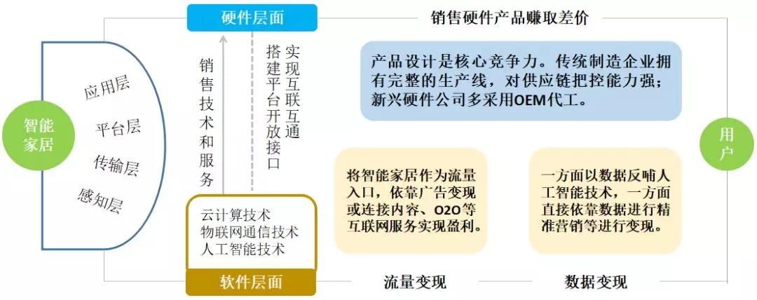 將智能家居劃分為硬件和軟件兩個(gè)層面,其中硬件對(duì)應(yīng)于智能家居的應(yīng)用層,軟件對(duì)于智能家居的平臺(tái)層、傳輸層和感知層。硬件產(chǎn)品的品牌方專(zhuān)注于產(chǎn)品側(cè)的設(shè)計(jì)和制造,向終端用戶(hù)提供的是智能家居的物理屬性,通過(guò)銷(xiāo)售硬件賺取差價(jià)實(shí)現(xiàn)盈利。針對(duì)智能家用產(chǎn)品的云計(jì)算、物聯(lián)網(wǎng)通信和人工智能三項(xiàng)核心技術(shù),技術(shù)供應(yīng)商通常會(huì)提供其中的一項(xiàng)或多項(xiàng)能力。他們既可以選擇直接通過(guò)向硬件廠商銷(xiāo)售技術(shù)和服務(wù)變現(xiàn),也可以選擇以硬件產(chǎn)品連接到海量的終端用戶(hù),利用獲取到的用戶(hù)流量和數(shù)據(jù),通過(guò)面向消費(fèi)者的互聯(lián)網(wǎng)服務(wù)和面向企業(yè)的數(shù)據(jù)服務(wù)進(jìn)行變現(xiàn)。