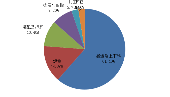 在國(guó)產(chǎn)工業(yè)機(jī)器人市場(chǎng)中,搬運(yùn)及上下料銷(xiāo)量同比增長(zhǎng)40.8%,占比達(dá)61.4%;焊接銷(xiāo)量同比增長(zhǎng)9.7%,占比達(dá)14.8%;裝配及拆卸銷(xiāo)量同比增長(zhǎng)5.4%,占比達(dá)10.4%。