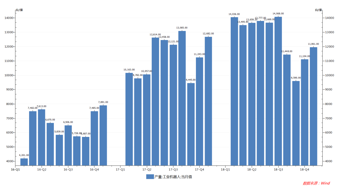 2018年1-12月,我國(guó)工業(yè)機(jī)器人產(chǎn)量達(dá)14.7萬(wàn)臺(tái),同比增長(zhǎng)12.2%;其中12月份產(chǎn)量達(dá)11961臺(tái)。受?chē)?guó)內(nèi)宏觀經(jīng)濟(jì)下行,下游汽車(chē)、3C、新能源等行業(yè)投資放緩和中美貿(mào)易戰(zhàn)的影響,國(guó)內(nèi)工業(yè)機(jī)器人行業(yè)發(fā)展壓力逐步顯現(xiàn),6月、7月、8月增幅相比前幾個(gè)月35%的增速大幅下降。但工業(yè)機(jī)器人行業(yè)短期的增速放緩并不能改變機(jī)器代人的大趨勢(shì)。我國(guó)自動(dòng)化改造空間巨大,制造業(yè)轉(zhuǎn)型升級(jí)迫切;人口紅利逐步消失,老齡化問(wèn)題嚴(yán)重,勞動(dòng)力出現(xiàn)短缺;疊加國(guó)家政策的大力支持,我國(guó)工業(yè)機(jī)器人行業(yè)未來(lái)發(fā)展空間仍然巨大。