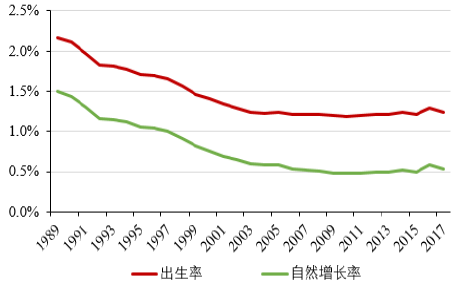 另一方面,中國(guó)近年來(lái)的人口出生率和自然增長(zhǎng)率也呈現(xiàn)不斷下降的趨勢(shì),2017年比2016年出生人口減少了63萬(wàn)人,人口出生率僅為12.4‰,同比降低0.5‰,這一數(shù)據(jù)比日本的出生率還要低。我國(guó)的人口自然增長(zhǎng)率更是下降到5.3‰,長(zhǎng)期的低生育水平直接加大了對(duì)未來(lái)我國(guó)勞動(dòng)力不足的擔(dān)憂(yōu)。