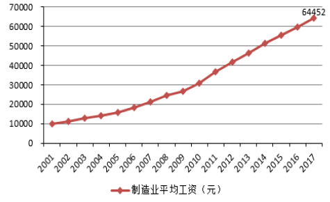 除了未來(lái)勞動(dòng)力不足之外,中國(guó)制造業(yè)員工的平均工資則呈現(xiàn)逐年增長(zhǎng)的態(tài)勢(shì),2017年已升至64452元,同比增長(zhǎng)8.4%。勞動(dòng)力成本不斷上升,用機(jī)器人代替人工也是更加經(jīng)濟(jì)、符合市場(chǎng)規(guī)律的必然選擇。目前,“世界工廠(chǎng)”正不斷的從中國(guó)向東南亞等其他國(guó)家和地區(qū)轉(zhuǎn)移,中國(guó)改革開(kāi)放初期借助人口紅利快速發(fā)展的條件已然不復(fù)存在。解決勞動(dòng)力不足、勞動(dòng)力成本上升的主要途徑就是智能制造,即生產(chǎn)過(guò)程的自動(dòng)化、智能化產(chǎn)業(yè)升級(jí)。未來(lái)通過(guò)產(chǎn)業(yè)的轉(zhuǎn)型升級(jí)更加注重質(zhì)量和效益的提升,“機(jī)器代人”的生產(chǎn)方式將會(huì)更加普遍。