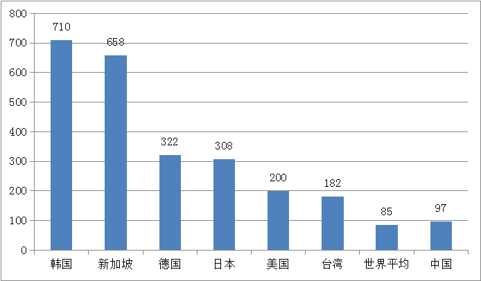 2017年全球主要市場(chǎng)工業(yè)機(jī)器人密度對(duì)比(臺(tái)/萬(wàn)人)