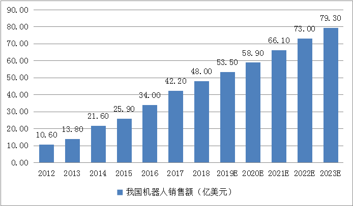 2018年,我國(guó)工業(yè)機(jī)器人銷(xiāo)售額達(dá)48億美元,同比增長(zhǎng)24.1%。未來(lái)隨著生產(chǎn)方式向柔性、智能、精細(xì)轉(zhuǎn)變,對(duì)工業(yè)機(jī)器人的需求將呈現(xiàn)大幅增長(zhǎng)。根據(jù)前瞻產(chǎn)業(yè)研究院的預(yù)測(cè),到2023年,國(guó)內(nèi)市場(chǎng)規(guī)模將翻一番,進(jìn)一步擴(kuò)大到79.3億美元。
