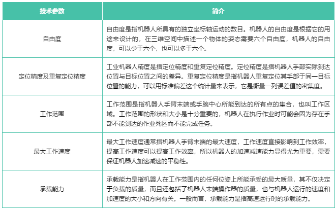 工業(yè)機(jī)器人的主要技術(shù)參數(shù)一般有自由度、定位精度及重復(fù)定位精度、工作范圍、最大工作速度和承載能力等。這些參數(shù)是工業(yè)機(jī)器人本體制造過(guò)程中重要的考量指標(biāo),是衡量一家廠(chǎng)商本體制造水平高低的標(biāo)準(zhǔn)。