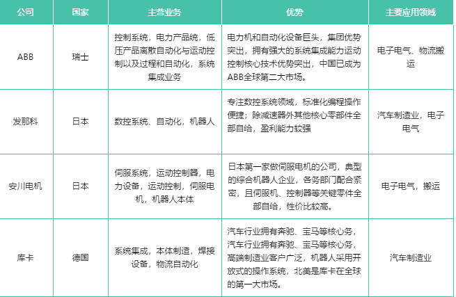 在世界工業(yè)機(jī)器人行業(yè)中,以瑞士的ABB、德國(guó)的庫(kù)卡、日本的發(fā)那科和安川電機(jī)最為著名,并稱(chēng)為工業(yè)機(jī)器人“四大家族”。它們?cè)趤喼奘袌?chǎng)上同樣有著舉足輕重的地位,在中國(guó)工業(yè)機(jī)器人市場(chǎng)上占據(jù)大半江山,幾乎壟斷了機(jī)器人本體制造、焊接等高端領(lǐng)域。