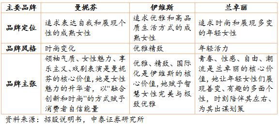 公司實行多品牌運作戰(zhàn)略,針對不同年齡段和不同風(fēng)格的消費者推出三個中高端核心品牌“曼妮芬”、 “伊維斯”和“蘭卓麗”,三個副牌COYEEE、Bodybeauty 和喬百仕。其中,主打品牌“曼妮芬”連續(xù) 12 年市占率第一,其市占率長期領(lǐng)先于規(guī)模最大的內(nèi)衣公司安莉芳的主品牌“安莉芳”。第二大品牌“伊維斯”連續(xù)兩年市場份額排名前十。