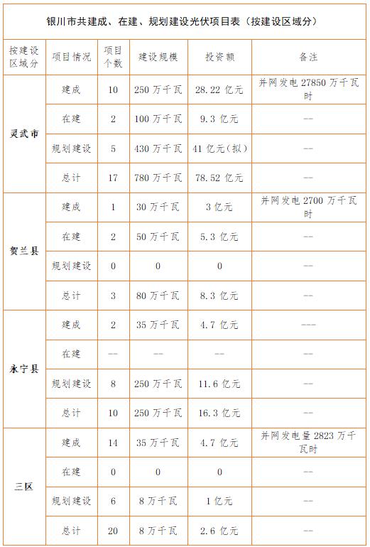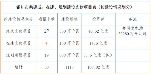銀川市發(fā)改委項(xiàng)目資料顯示情況:截止2017年上半年,銀川市共建成、在建、規(guī)劃建設(shè)光伏項(xiàng)目50個,建設(shè)規(guī)模1118萬千瓦,投資約108.82億元。