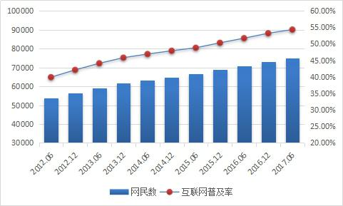 根據(jù)CNNIC最新數(shù)據(jù)顯示,截止2017年6月,我國網(wǎng)民規(guī)模達(dá)到7.51億,半年共計(jì)新增網(wǎng)民1992萬人。互聯(lián)網(wǎng)普及率為54.3%,較2016年底提升1.1個(gè)百分點(diǎn)。我國網(wǎng)民規(guī)模增長趨于穩(wěn)定,互聯(lián)網(wǎng)行業(yè)持續(xù)穩(wěn)健發(fā)展,以互聯(lián)網(wǎng)為代表的數(shù)字技術(shù)正在加速與經(jīng)濟(jì)社會各領(lǐng)域深度融合,成為促進(jìn)我國消費(fèi)升級、經(jīng)濟(jì)社會轉(zhuǎn)型、構(gòu)建國家競爭新優(yōu)勢的重要推動(dòng)力。