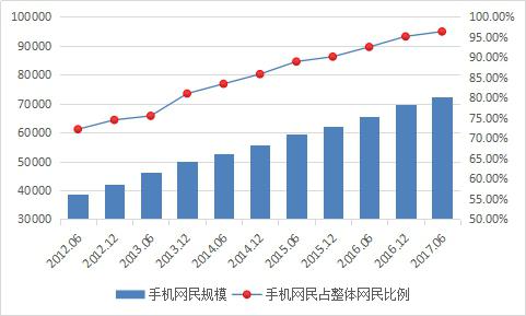 截至2017年6月,我國手機(jī)網(wǎng)民規(guī)模達(dá)7.24億,較2016年底增加2830萬人。網(wǎng)民使用手機(jī)上網(wǎng)的比例由2016年底的95.1%提升至96.3%。,移動(dòng)互聯(lián)網(wǎng)經(jīng)過多年發(fā)展已經(jīng)進(jìn)入相對成熟階段。過去幾年來,移動(dòng)網(wǎng)民增速遠(yuǎn)超過整體網(wǎng)民增速,中國整體網(wǎng)民的增長已經(jīng)由PC網(wǎng)民增長轉(zhuǎn)移到移動(dòng)網(wǎng)民的增長。移動(dòng)端網(wǎng)民數(shù)的快速增長,直接推動(dòng)短視頻行業(yè)發(fā)展。