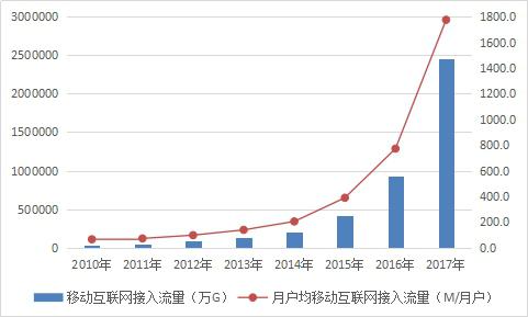 2017年,4G移動(dòng)電話用戶總數(shù)達(dá)9.94億戶,2017年移動(dòng)互聯(lián)網(wǎng)接入流量消費(fèi)達(dá)246億G,同比增長162.7%,比上年提高38.7個(gè)百分點(diǎn)。月戶均移動(dòng)互聯(lián)網(wǎng)接入流量達(dá)到1775M,是上年的2.3倍。其中,手機(jī)上網(wǎng)流量達(dá)到235億GB,比上年增長179%,在移動(dòng)互聯(lián)網(wǎng)總流量中占95.6%,成為推動(dòng)移動(dòng)互聯(lián)網(wǎng)流量高速增長的主要因素。