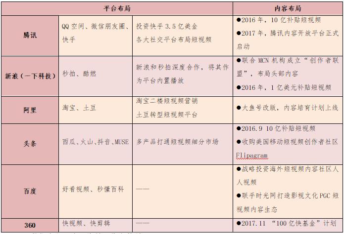 以BAT為首的機(jī)構(gòu)重金加速布局短視頻平臺。今日頭條、騰訊、秒拍等均投入10億元扶持短視頻內(nèi)容創(chuàng)業(yè)者。阿里投入20億元進(jìn)軍短視頻領(lǐng)域,將土豆網(wǎng)打造為專門的短視頻平臺。騰訊專門成立短視頻中心,負(fù)責(zé)短視頻平臺運(yùn)行;愛奇藝短視頻平臺的愛奇藝頭條正在內(nèi)測;秒拍成為新浪微博獨(dú)家短視頻應(yīng)用,從工具型短視頻機(jī)構(gòu)轉(zhuǎn)型為社交分享類短視頻平臺;華人文化基金領(lǐng)投的資訊類短視頻平臺梨視頻也已形成業(yè)內(nèi)影響力;咪咕視訊作為中國移動(dòng)在視頻領(lǐng)域的唯一版權(quán)運(yùn)營實(shí)體,也布局短視頻,與中央電視臺共建業(yè)內(nèi)領(lǐng)先的短視頻創(chuàng)作者聚集平臺,打造頭部賬號體系,孵化自有明星短視頻賬號,引入知名工作室直接簽約,盤整已有的強(qiáng)IP資源賬號化運(yùn)作。