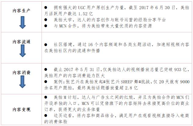 美拍依托美圖公司的“泛女性化”產(chǎn)品布局,搭建完整的自有短視頻平臺生態(tài)閉環(huán),業(yè)務(wù)涉及內(nèi)容生產(chǎn)、內(nèi)容流通、內(nèi)容消費(fèi)和內(nèi)容變現(xiàn)整個(gè)產(chǎn)業(yè)鏈條。